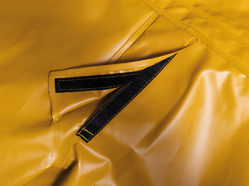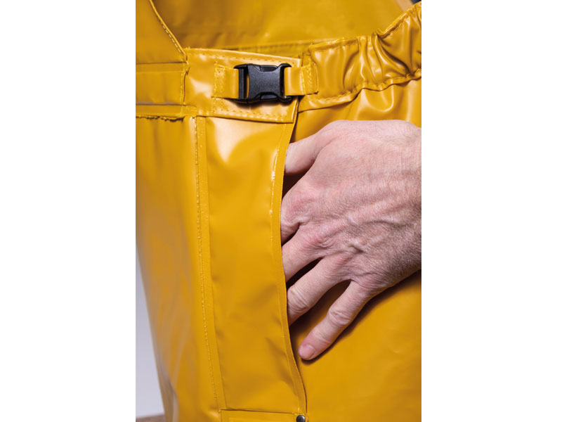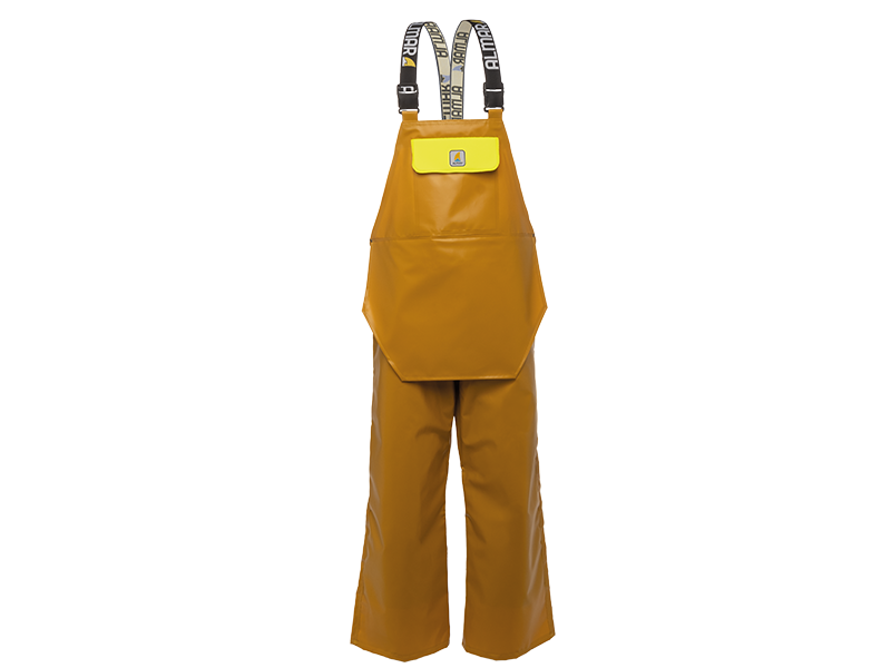 Pantalón con delantal de doble tejido en la parte delantera con bolsillo para rodillera, bragueta con tapeta y cierre con velcro, tirantes elásticos ajustables, bolsillo en el pecho y cierre lateral con hebilla. Bolsillo del pecho tapa en flúor